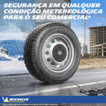 (1) - travagem em piso seco - Testes de travagem em piso seco realizados pela IDIADA, a pedido da Michelin, em 2017 e 2019, na dimensão 235/65 R16C 115/113 R, com o Mercedes-Benz Sprinter, em comparação com os seus principais concorrentes de pneus de verão, inverno e todas as estações (MICHELIN Agilis CrossClimate (40,7 m) em comparação com o BRIDGESTONE Duravis 660 (41,7 m), CONTINENTAL ContiVanContact™ 100 (41,7 m); CONTINENTAL VanContact Winter (47,1 m), PIRELLI Carrier™ Winter (46,9 m), e MICHELIN Agilis CrossClimate (41,5 m) em comparação com o CONTINENTAL VanContact™ 4Season (47,1 m), PIRELLI Carrier™ All Season (44,0 m). E, em 2019, o MICHELIN Agilis CrossClimate (46,2 m) em comparação com o GOODYEAR Vector 4 Seasons Cargo (49,5 m). (1 bis) Estudo interno de travagem em piso seco em Ladoux, em novembro de 2020, na dimensão 235/65R16C 115/113 R, com o Mercedes-Benz Sprinter, MICHELIN Agilis CrossClimate (39,8 m) em comparação com o BRIDGESTONE Duravis All Season (41,5 m). (2) - piso molhado - Os MICHELIN Agilis CrossClimate têm marcação “A” na classificação europeia de Aderência em piso molhado. (3) - performance na neve - Os MICHELIN Agilis CrossClimate estão aprovados para serem utilizados na condução com neve graças à certificação 3PMSF (3 Peak Mountain Snowflake). (4) - longevidade - Testes de longevidade realizados pela DEKRA Test Center a pedido da Michelin, em 2017, na dimensão 235/65 R16C 115/113 R, com o Mercedes-Benz Sprinter, em comparação com os seus principais concorrentes com pneus de verão, inverno e todas as estações (VERÃO: MICHELIN Agilis CrossClimate (50 145 km); BRIDGESTONE Duravis 660 (42 760 km), CONTINENTAL ContiVanContact™ 100 (29 660 km), INVERNO: MICHELIN Agilis CrossClimate (50 412 km), CONTINENTAL VanContact Winter (32 863 km), PIRELLI Carrier™ Winter (33 009 km); TODAS AS ESTAÇÕES: MICHELIN Agilis CrossClimate (47 702 km) CONTINENTAL VanContact™4Season (21 396 km), PIRELLI Carrier™ All Season (30 467 km), GOODYEAR Vector 4 Seasons (29 790 km)). Teste de longevidade em uso real médio (D50) com percurso de 10 000 km e extrapolado com longevidade estimada a 1,6 mm. (5) - longevidade - Estudo interno da Michelin realizado na presença da DEKRA Test Center (Circuito de Narbonne), entre dezembro de 2020 e fevereiro de 2021, na dimensão 235/65R16C 115/113 R, com o Renault Master, MICHELIN Agilis CrossClimate (29 789 km) em comparação com o BRIDGESTONE Duravis All Season (22 023 km). Teste de longevidade em uso real médio (D50) com percurso de 9421 km e extrapolado com longevidade estimada a 1,6 mm.